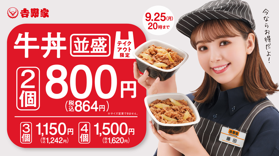 テイクアウトの牛丼並盛2個、3個、4個セットがお得にご購入いただけます。