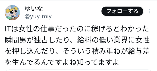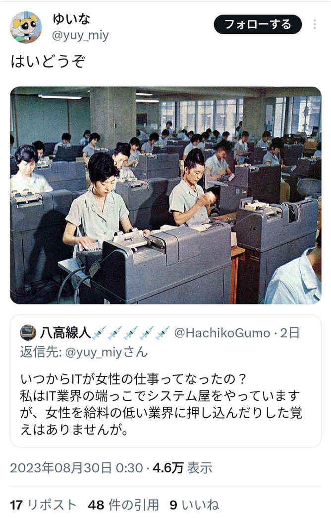 ITは女性の仕事だったのに稼げるとわかった瞬間男が独占したり、給料の低い業界に女性を押し込んだり、そういう積み重ねが給与差を生んでるんですよね知ってますよ https://t.co/i7AUaLojW2