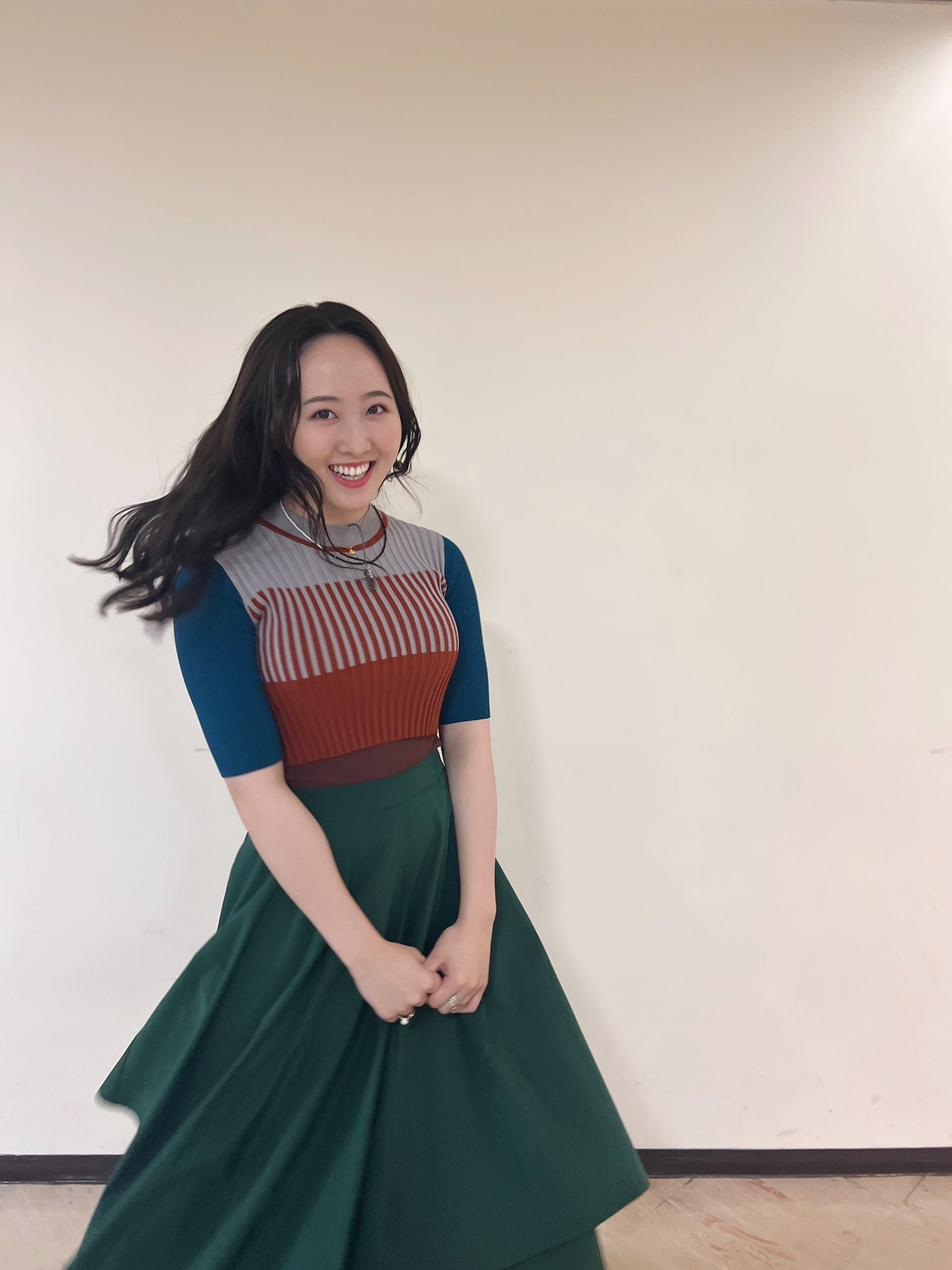 肌に密着した茶色と青を基調にしたピッタリサイズのニットにモスグリーンのロングカートというコーデ。