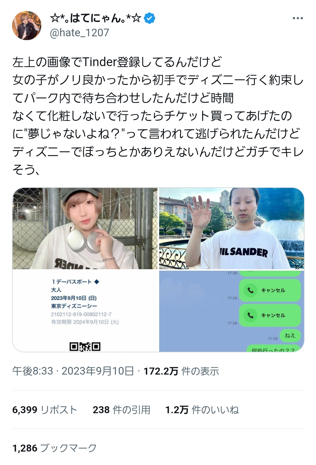 なくて化粧しないで行ったらチケット買ってあげたのに”夢じゃないよね?”って言われて逃げられたんだけどディズニーでぼっちとかありえないんだけどガチでキレそう、 pic.twitter.com/As2bavvcKh— ☆*。はてにゃん。*☆ (@hate_1207) September 10, 2023