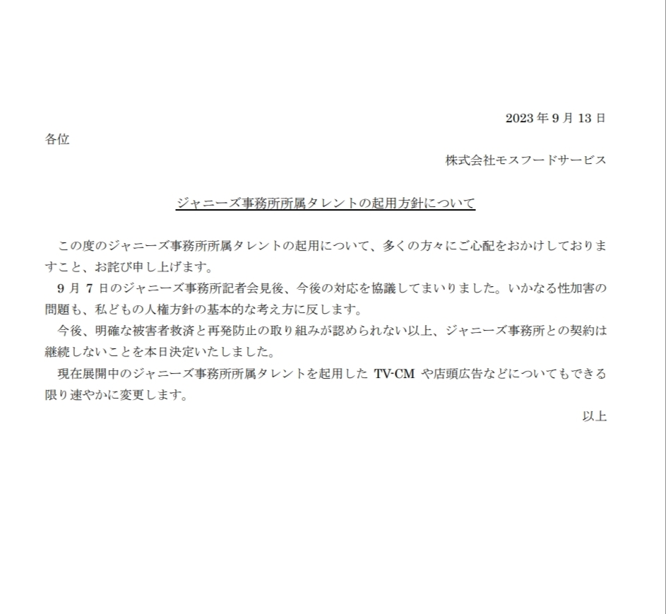 モスフードは「今後、明確な被害者救済と再発防止の取り組みが認められない以上、同事務所との契約を継続しない」とコメントした。現在展開中の同事務所の所属タレントを起用したCMや店頭広告についても「できる限り速やかに変更する」としている。