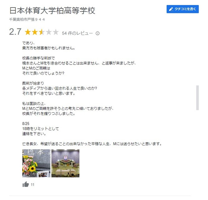 娘を亡くした父親(おそらくいじめが原因?)が書いたレビューとある生徒の親と教員に対する恨みが書かれている