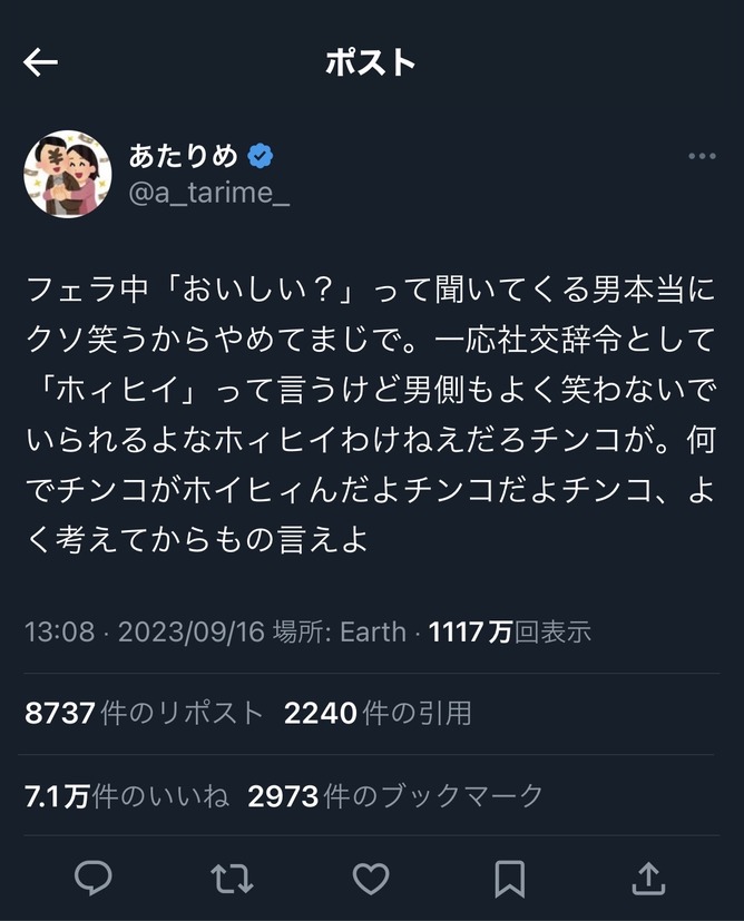 フェラ中「おいしい?」って聞いてくる男本当にクソ笑うからやめてまじで。一応社交辞令として「ホィヒイ」って言うけど男側もよく笑わないでいられるよなホィヒイわけねえだろチンコが。何でチンコがホイヒィんだよチンコだよチンコ、よく考えてからもの言えよ