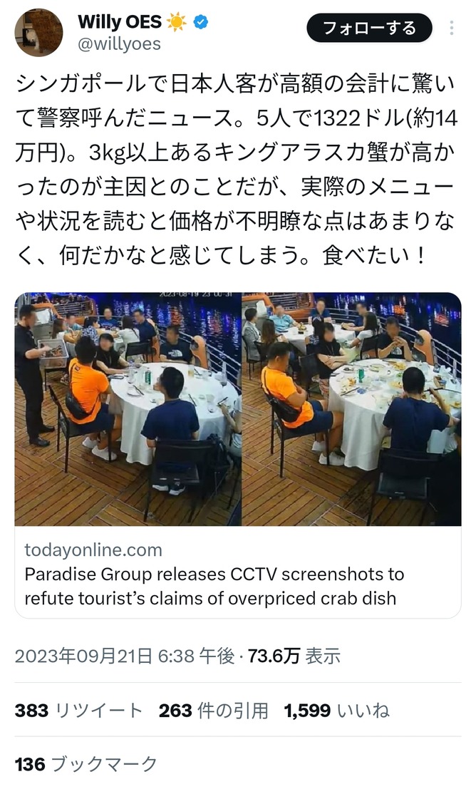 シンガポールで日本人客が高額の会計に驚いて警察呼んだニュース。5人で1322ドル(約14万円)。3kg以上あるキングアラスカ蟹が高かったのが主因とのことだが、実際のメニューや状況を読むと価格が不明瞭な点はあまりなく、何だかなと感じてしまう。食べたい!https://t.co/NXy4TmfQMJ