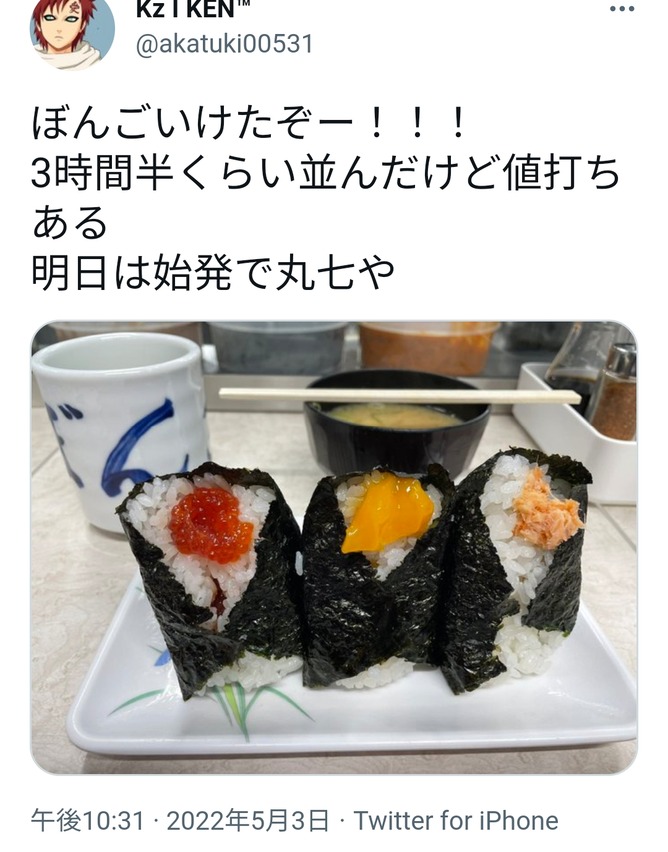 明日は始発で丸七や pic.twitter.com/Gi7xfneSHW— Kz I KEN™︎ (@akatuki00531) May 3, 2022