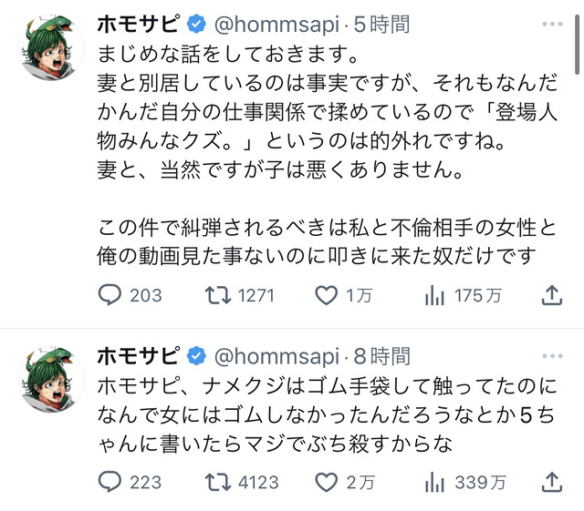 妻と別居しているのは事実ですが、それもなんだかんだ自分の仕事関係で揉めているので「登場人物みんなクズ。」というのは的外れですね。