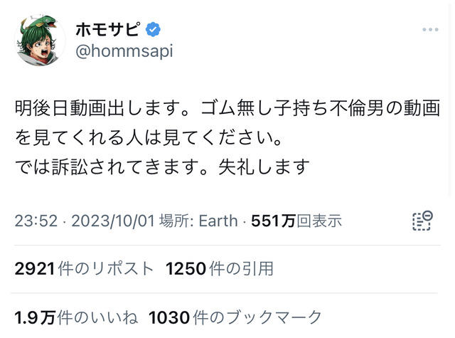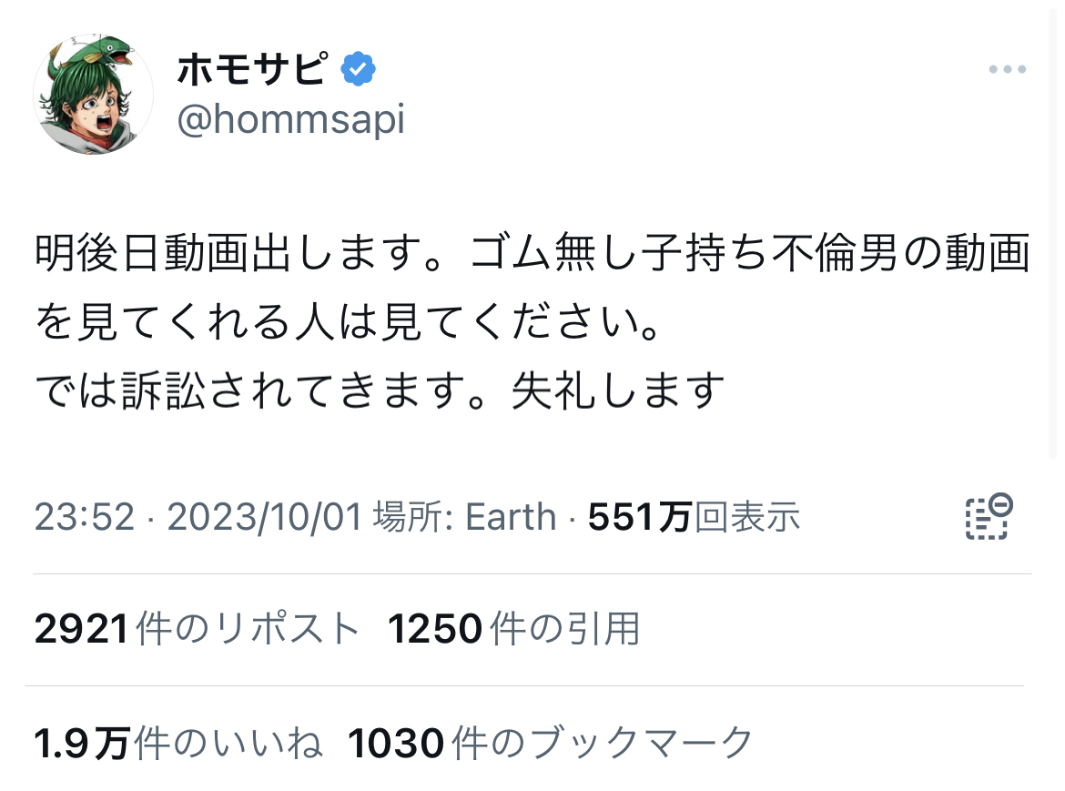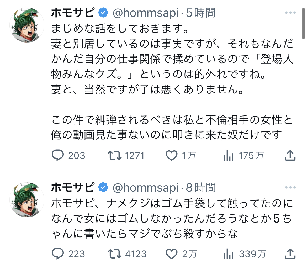妻と、当然ですが子は悪くありません。この件で糾弾されるべきは私と不倫相手の女性と俺の動画見た事ないのに叩きに来た奴だけです