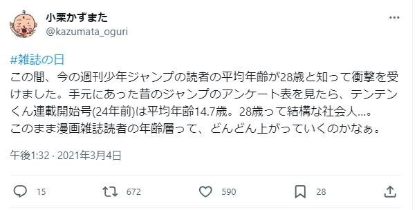 このまま漫画雑誌読者の年齢層って、どんどん上がっていくのかなぁ。— 小栗かずまた (@kazumata_oguri) March 4, 2021
