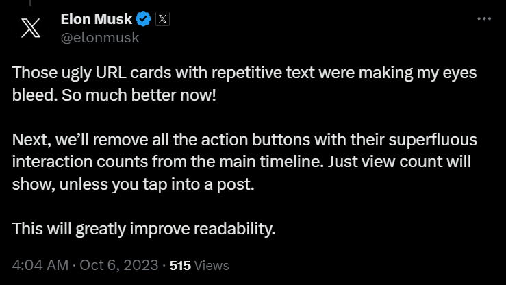 【悲報】イーロンマスクさん、X(旧ツイッター)のいいねとRT数の表示を無くす方針を表明 2023/10/6 哲学ニュースnwk 1: それでも動く名無し 2023/10/06(金) 18:42:04.53 ID:Vkysn5AE0 こいつTwitterがウケてたこと理解してないやろ 三大復活してほしい番組 トリビアの泉 いいとも あと一つは 続きを読む Source: 哲学ニュースnwk