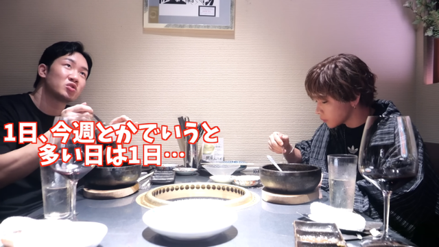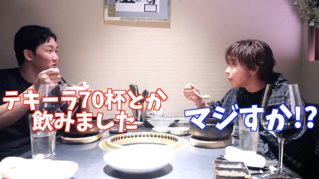 また「酒がめっちゃ強くて、多い日は1日でテキーラ70杯飲みました」というと、タケヤキは「マジすか!」と思わず声を上げる。高級肉を堪能した後も「この後、爆飲みなんで」といい、驚かせていた。
