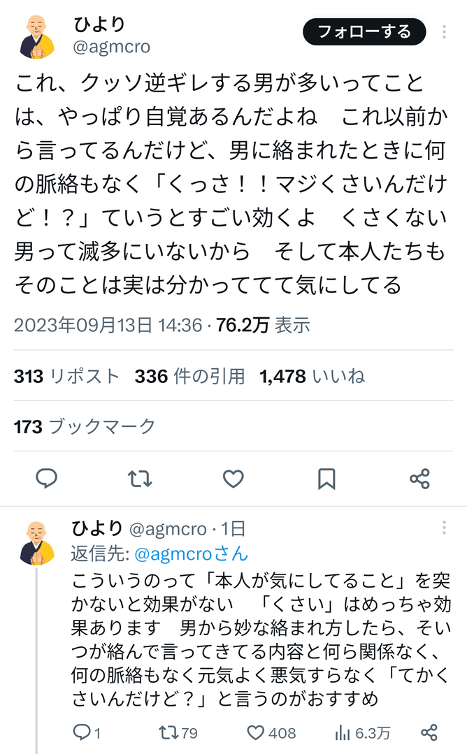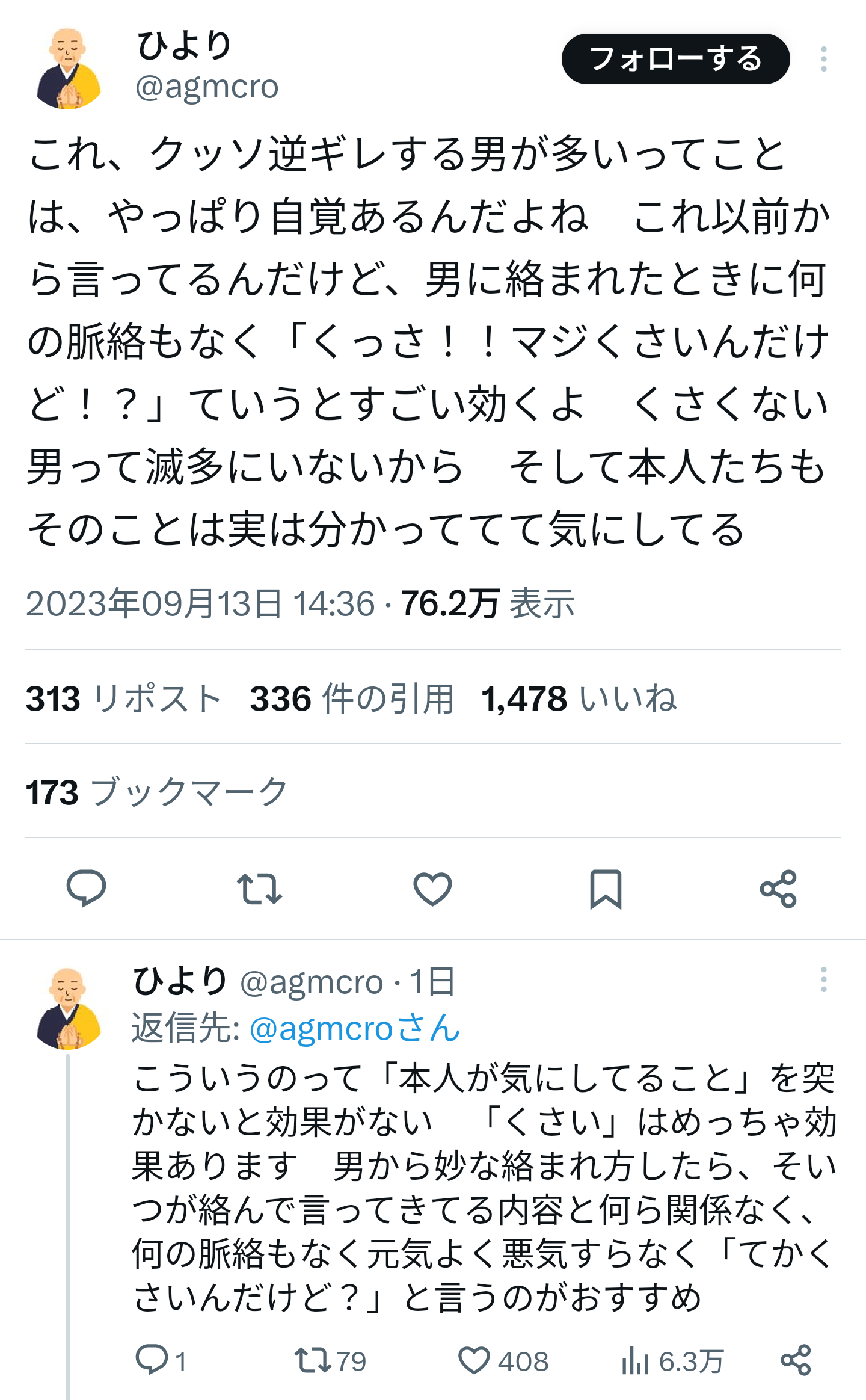 これ、クッソ逆ギレする男が多いってことは、やっぱり自覚あるんだよね これ以前から言ってるんだけど、男に絡まれたときに何の脈絡もなく「くっさ!!マジくさいんだけど!?」ていうとすごい効くよ くさくない男って滅多にいないから そして本人たちもそのことは実は分かっててて気にしてる
