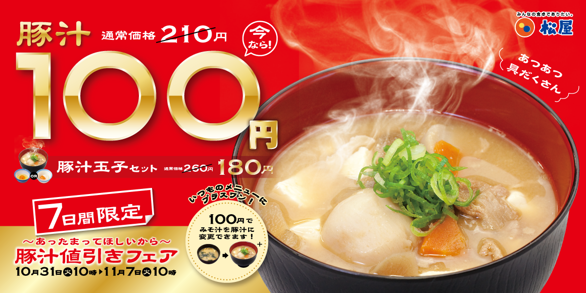 牛めし・カレー・定食・その他丼の「松屋」(松屋フーズ)は、「豚汁値引きフェア」を10月31日10時〜11月7日10時の期間実施し、通常価格210円の「豚汁」を100円で販売する。テイクアウトも可能。https://gourmet.watch.impress.co.jp/docs/news/1542394.html