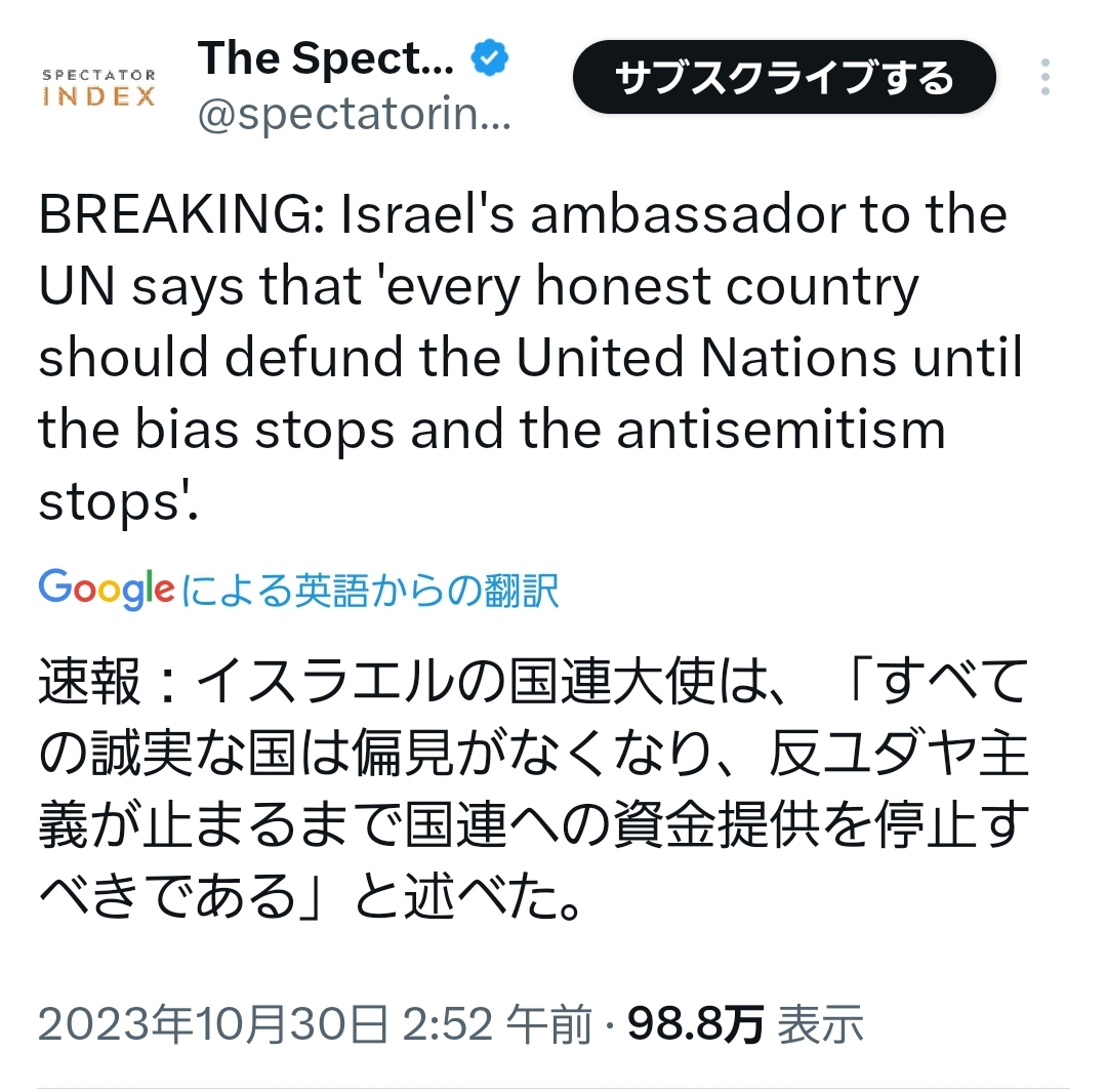 【速報】イスラエル国連大使「反ユダヤ主義が止まるまで国連への資金提供止めては?」 2023/10/30 暇人\^o^/速報 1: 名無しさん@おーぷん 23/10/30(月) 13:11:27 ID:2N9L 20: 名無しさん@おーぷん 23/10/30(月) 13:16:18 ID:QlfR 世界がイスラエルから孤立している 32: 名無しさん@おーぷん 23/10/30(月) 13:19:09 ID:1MSv 何やこれ草 続きを読む Source: 暇人\^o^/速報