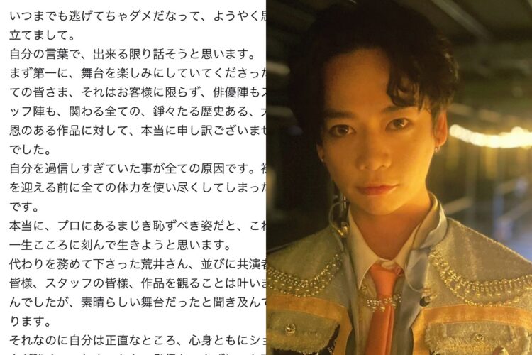 〈いま僕は人生のどん底にいます。真っ暗闇で、星のひとつも見えない混沌の中にいます。役を生きる事でしか生を感じられなかった壊れた僕は、役を取り上げられたらただの壊れたガラクタでしかなかった〉