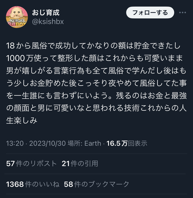 18から風俗で成功してかなりの額は貯金できたし1000万使って整形した顔はこれからも可愛いまま男が嬉しがる言葉行為も全て風俗で学んだし後はもう少しお金貯めた後こっそり夜やめて風俗してた事を一生誰にも言わずにいよう。残るのはお金と最強の顔面と男に可愛いなと思われる技術これからの人生楽しみ