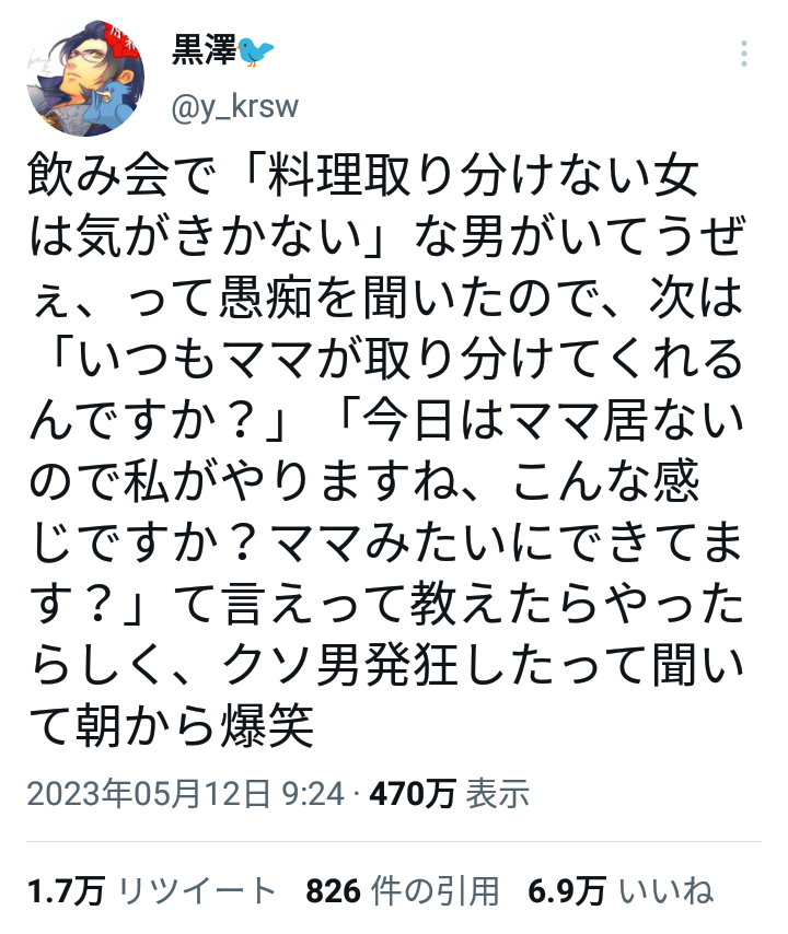 飲み会で「料理取り分けない女は気がきかない」な男がいてうぜぇ、って愚痴を聞いたので、次は「いつもママが取り分けてくれるんですか?」「今日はママ居ないので私がやりますね、こんな感じですか?ママみたいにできてます?」て言えって教えたらやったらしく、クソ男発狂したって聞いて朝から爆笑