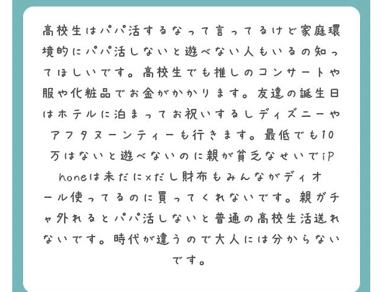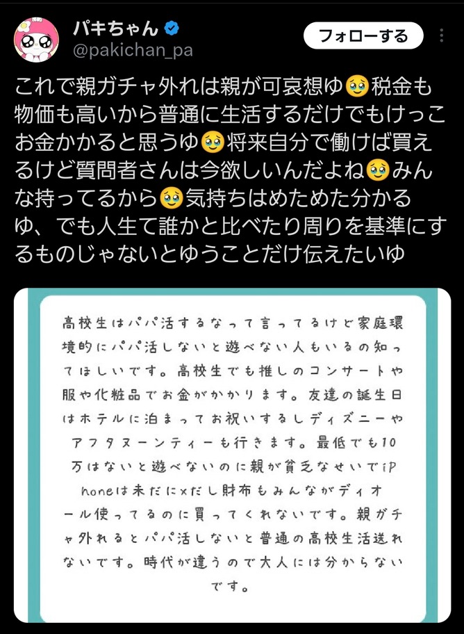 これで親ガチャ外れは親が可哀想ゆ🥹税金も物価も高いから普通に生活するだけでもけっこお金かかると思うゆ🥹将来自分で働けば買えるけど質問者さんは今欲しいんだよね🥹みんな持ってるから🥹気持ちはめためた分かるゆ、でも人生て誰かと比べたり周りを基準にするものじゃないとゆうことだけ伝えたいゆ pic.twitter.com/APzc35OVm5