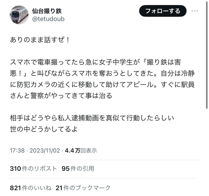 スマホで電車撮ってたら急に女子中学生が「撮り鉄は害悪!」と叫びながらスマホを奪おうとしてきた。自分は冷静に防犯カメラの近くに移動して助けてアピール。すぐに駅員さんと警察がやってきて事は治る