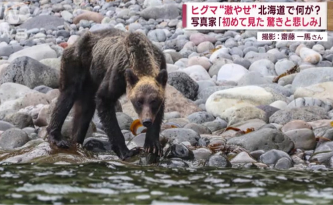 写真家 齋藤一馬さん:「あのレベルの痩せ細ったクマは初めて見たので、本当に餌(えさ)がないんだなと驚いた。これから冬眠に向けて蓄える時期だが、無事に冬を越せるのかなと悲しくなる。あの姿を見ると」