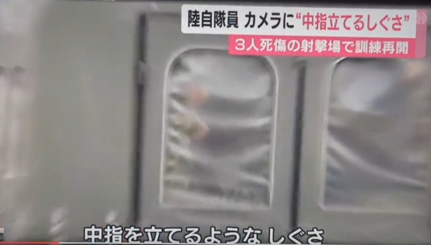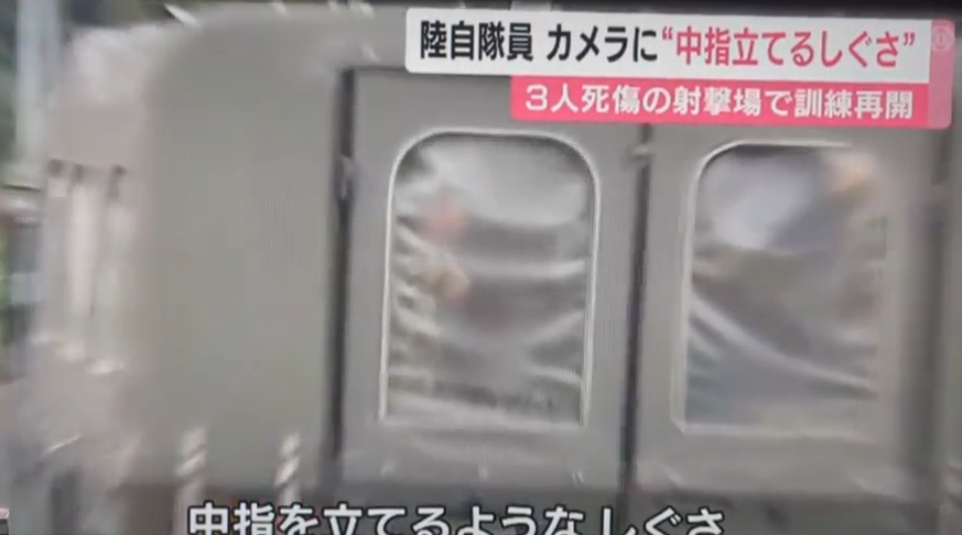 車両の後部に乗った隊員の1人が、集まった報道陣に向けて中指を立てるような仕草が見てとれました。