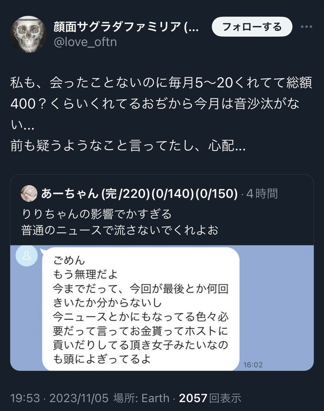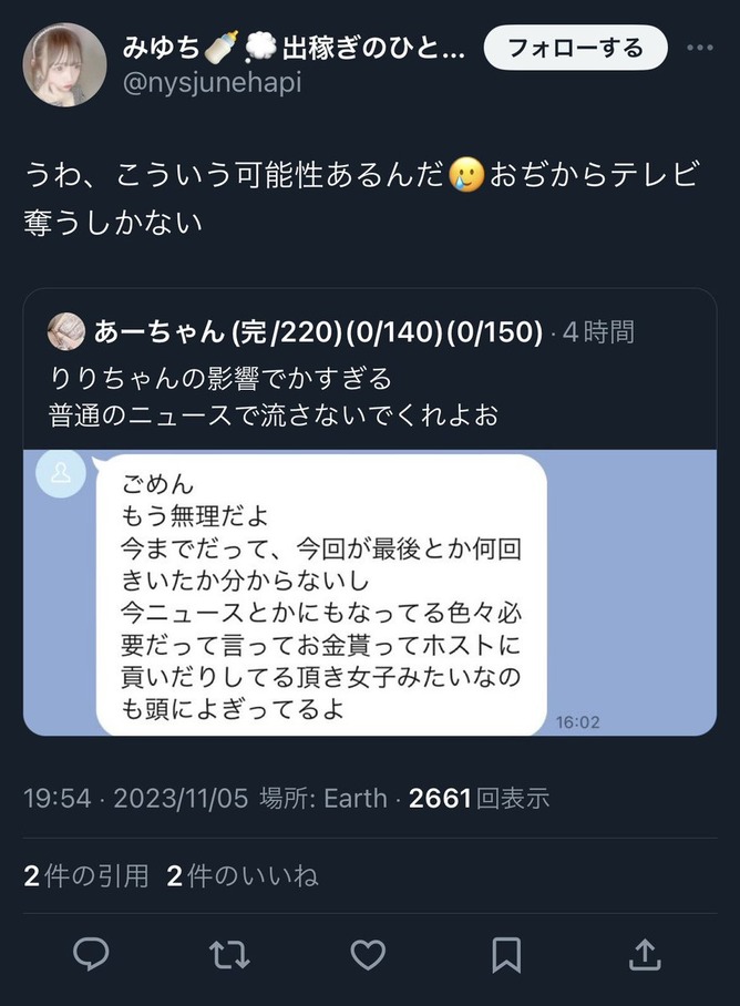 — みゆち🍼💭出稼ぎのひと૮ . ̫ .。 ა (@nysjunehapi) November 5, 2023