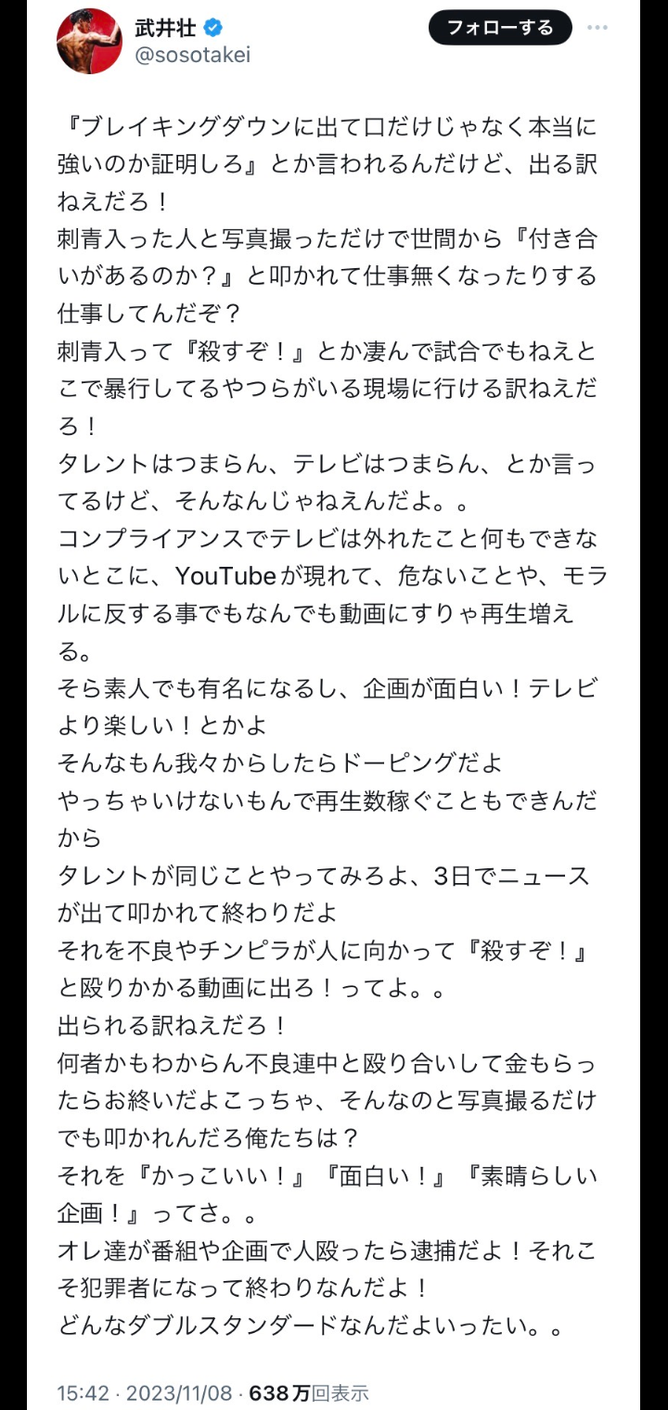 格闘技イベント「BreakingDown」で活躍する元アウトローのカリスマ瓜田純士が9日、X(旧ツイッター)を更新。タレント武井壮(50)が同イベントへの参加を拒絶した投稿を受け、「おもしろい人は規制やコンプラを言い訳に使わない」