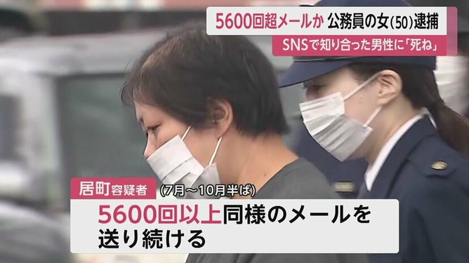 SNSで知り合った男性に「死ね」などと5600回以上メール送ったとみられる50歳の公務員の女が、ストーカー規制法違反の疑いで逮捕された。
