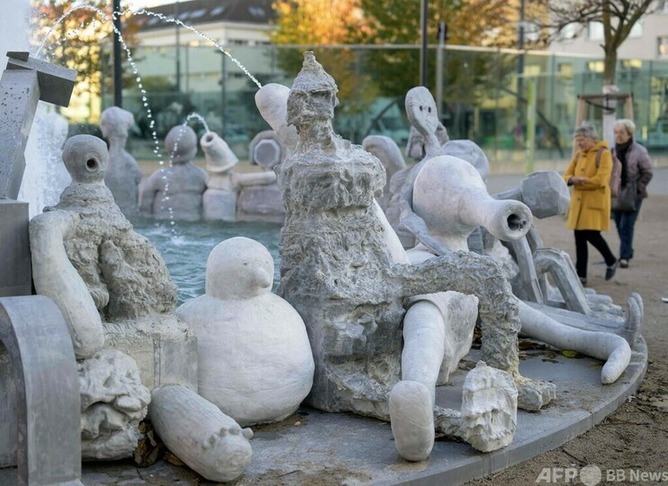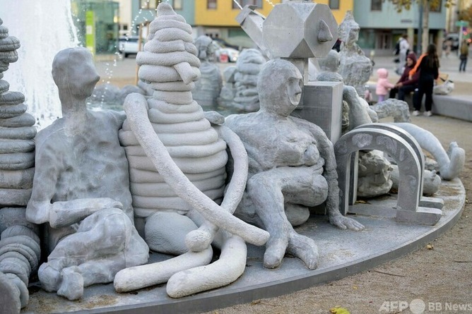 水盤の周りに人のような形をした彫像33体が輪になって座っているデザインを手掛けたのは、挑発的な作風で知られるウィーンを拠点に活動するアーティスト集団「ジェラティン(Gelitin)」。審査によって選ばれた。