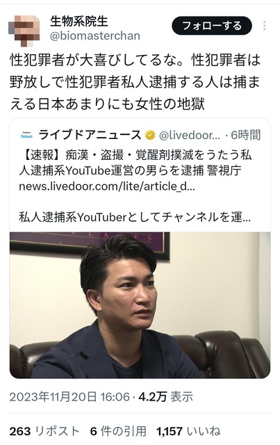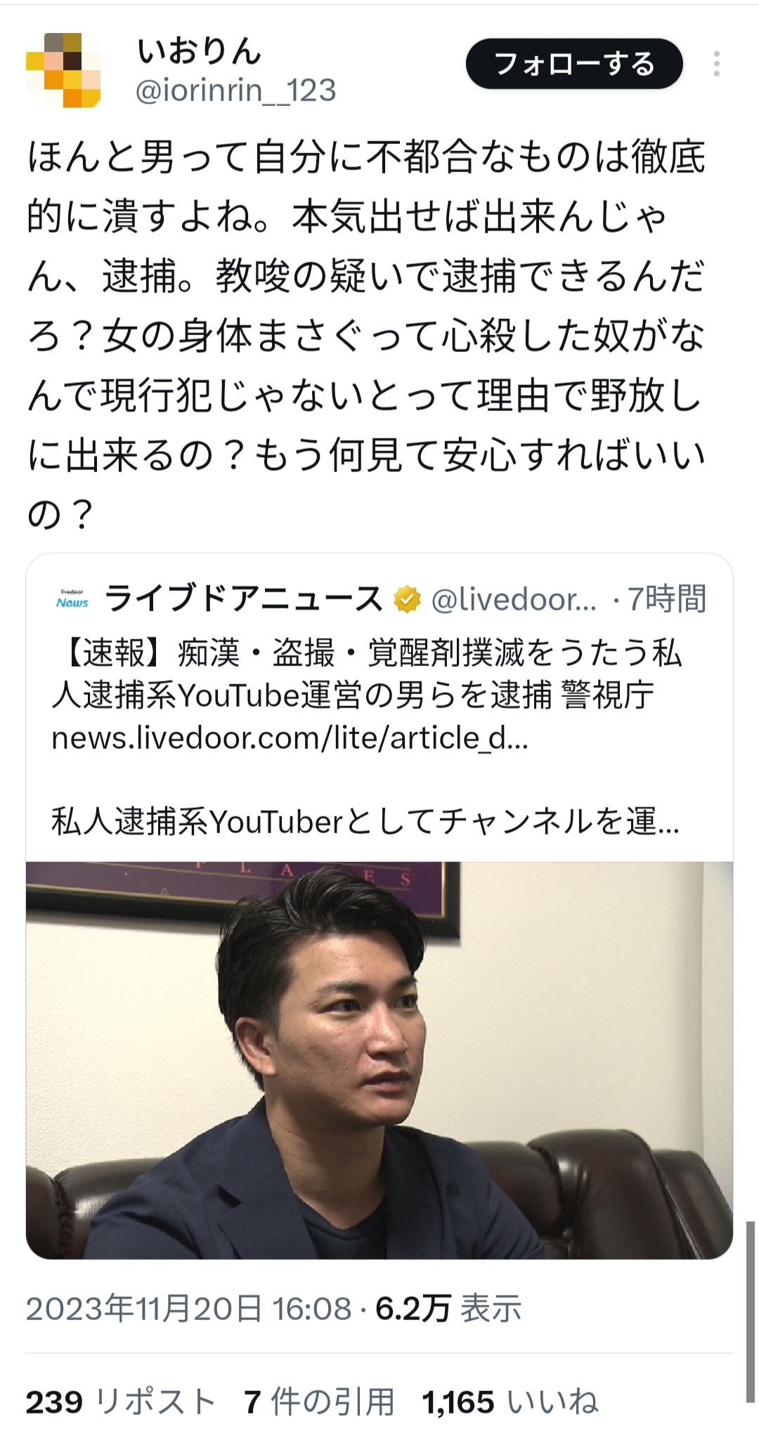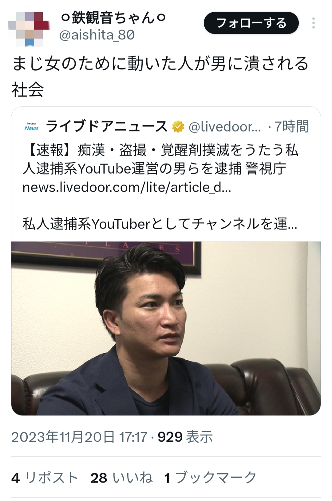 女さん「ガッツchを逮捕するな!女のために動いた人が男に潰される地獄」 2023/11/21 キニ速 1:名無しさん@おーぷん :23/11/21(火) 09:00:31ID:RtSg 2:名無しさん@おーぷん :23/11/21(火) 09:00:53ID:RtSg 続きを読む Source: キニ速