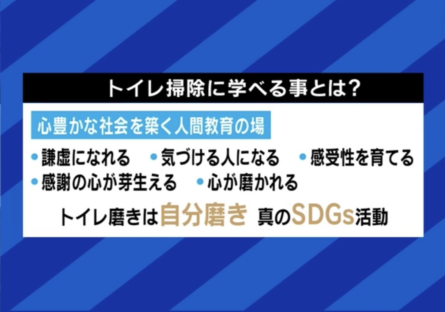 目線をトイレに合わせるのは、“気づく力“を育てるため。「全然見える世界が変わってくる。細かな汚れがこんなところにあったのかと。この汚れにはスポンジを使ったほうがいいのか、もうちょっと強力なナイロンたわしを使ったほうがいいのか、手洗いの下の配管周りは傷がついちゃうから柔らかいものでやろうとか。汚れを発見して、それにどう対処していけばいいかということも学べると思う」とした。