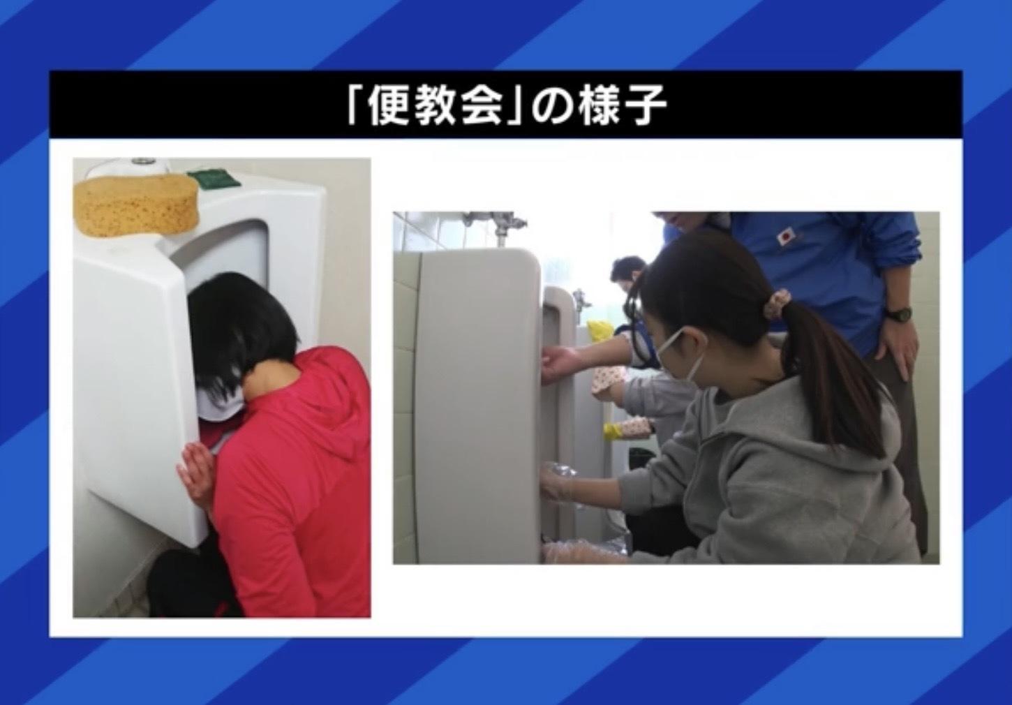 「便教会」は、腰を落とし目線を低くして、信念を持ってトイレ掃除を行うことで、多くの問題を抱える教育現場を変えるという目的のもと活動を実践しているという。
