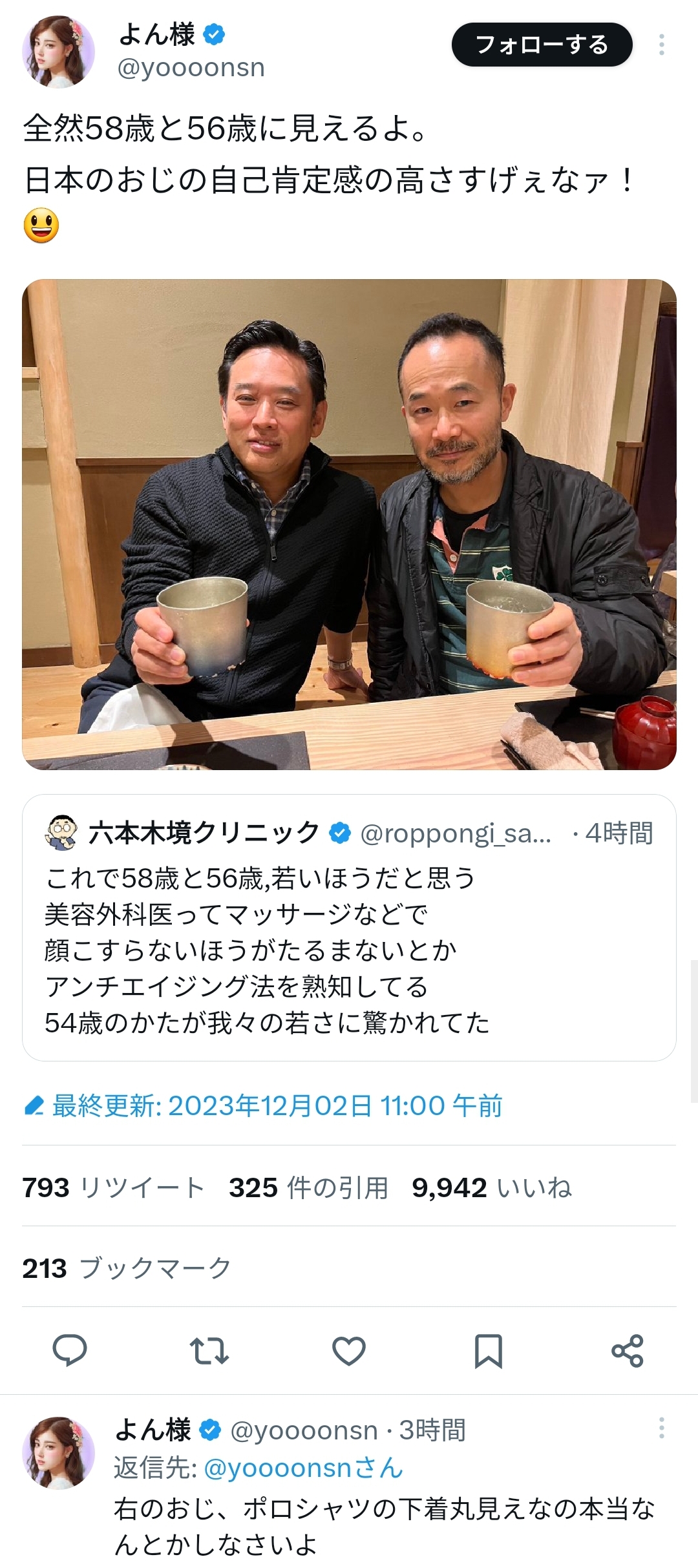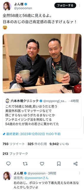 日本のおじの自己肯定感の高さすげぇなァ!?? https://t.co/9xJ44lxOX3 pic.twitter.com/YUagOEFeLD— よん様 (@yoooonsn) December 2, 2023