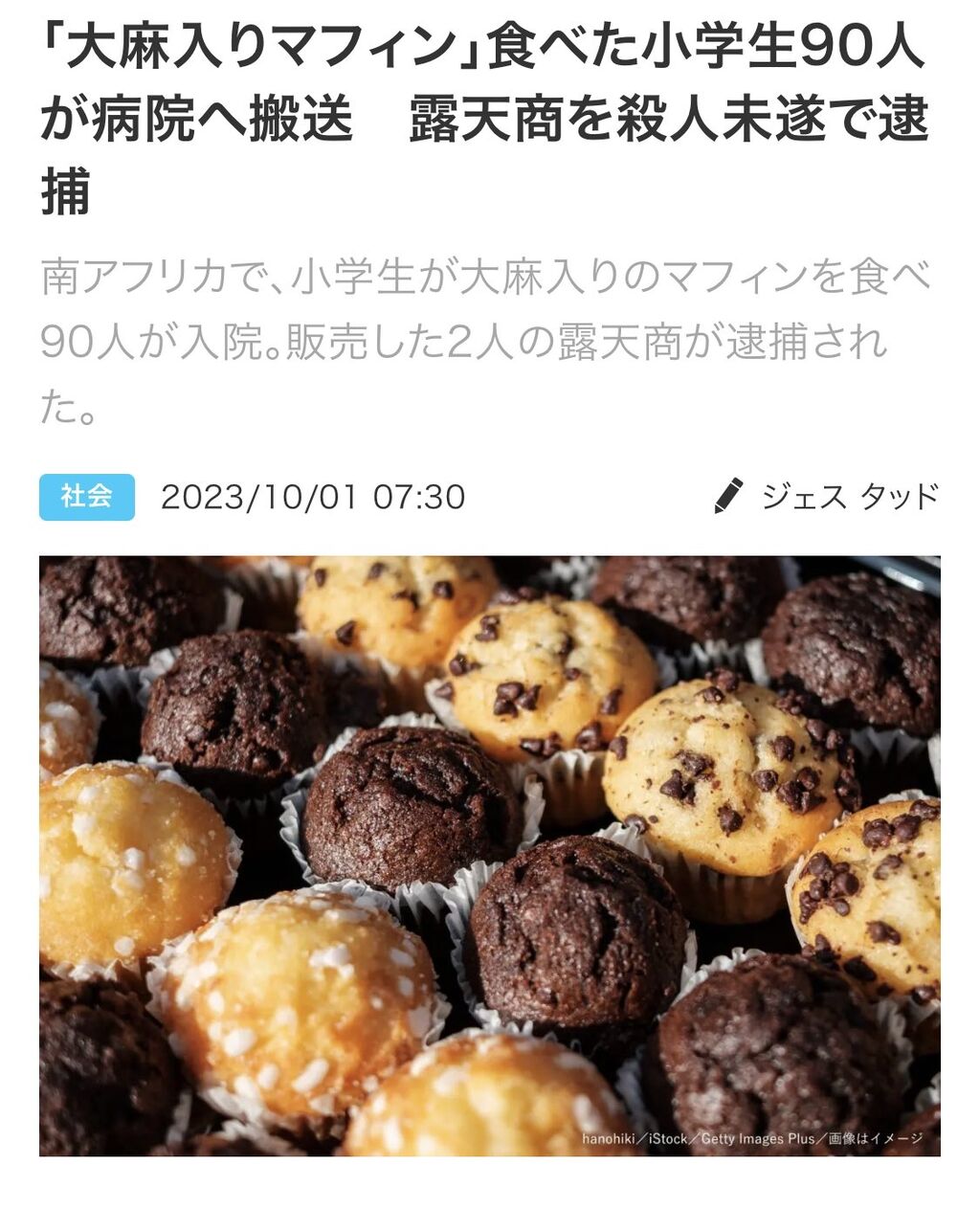 南アフリカで、小学生が大麻入りのマフィンを食べ90人が入院。販売した2人の露天商が逮捕された。