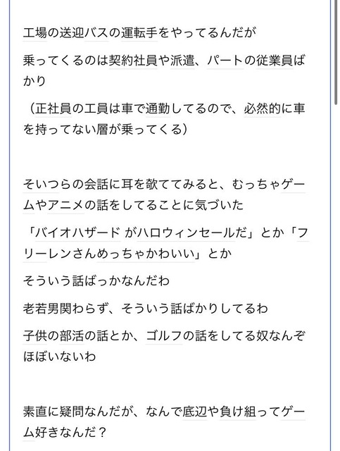 工場の送迎バスの運転手なんだが、派遣やパートの従業員がゲームとアニメの話ばっかしてる…なんで底辺ってゲームとかアニメが好きなんだろうか?