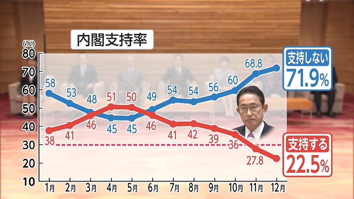岸田内閣の支持率は、5.3ポイント急落し22.5%で、内閣の「危険水域」と言われる3割を2カ月連続で割り込んだ。