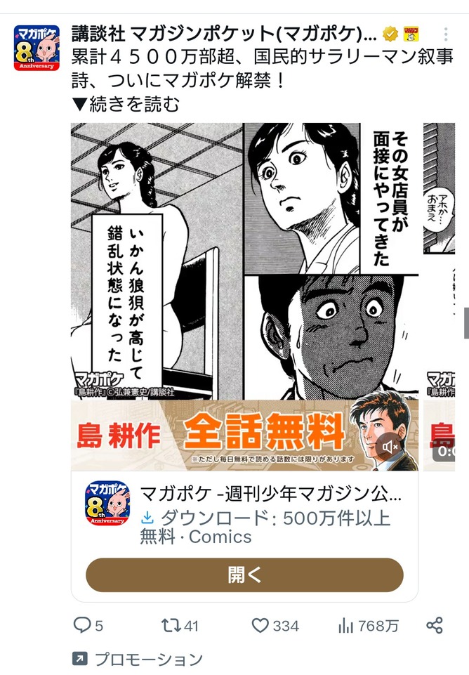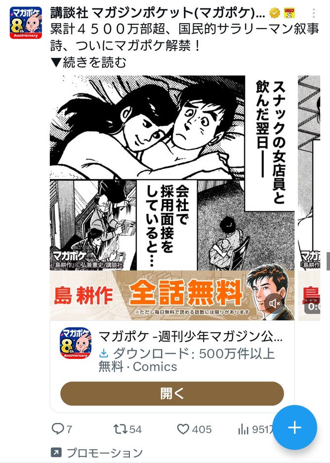 この機会にぜひ!!👇😊📚https://t.co/a00cL6Yaxj#島耕作#課長島耕作 pic.twitter.com/5GD8eoRMeZ— 講談社 マガジンポケット(マガポケ)公式 (@magapoke) September 9, 2023