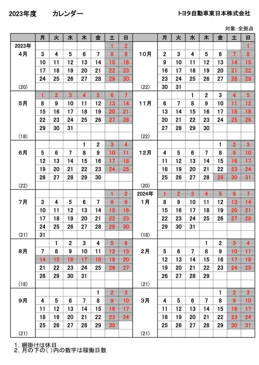 このカレンダーの他に20日休まないと駄目なんやで