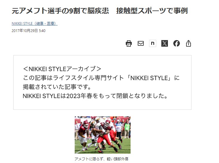 元アメフト選手の9割で脳疾患 接触型スポーツで事例