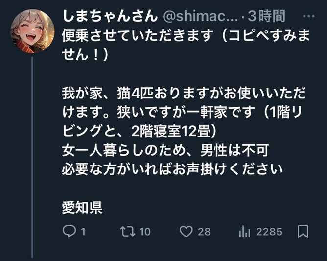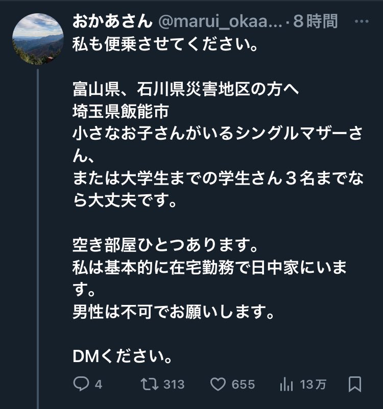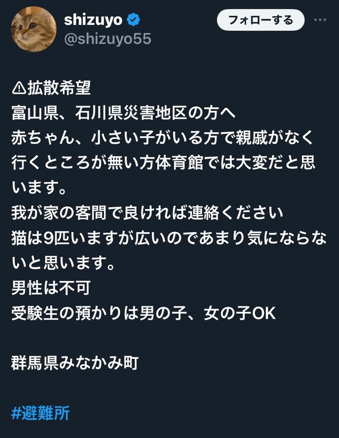 善人「被災して家に帰れない方は、うちに来てください!」※男性不可