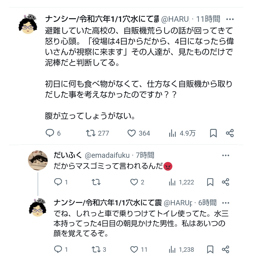 腹たったから書き込んできた。https://t.co/DVRGwSlGFP— ナンシー/令和六年1/1穴水にて震災経験者 (@HARUpin_u) January 6, 2024