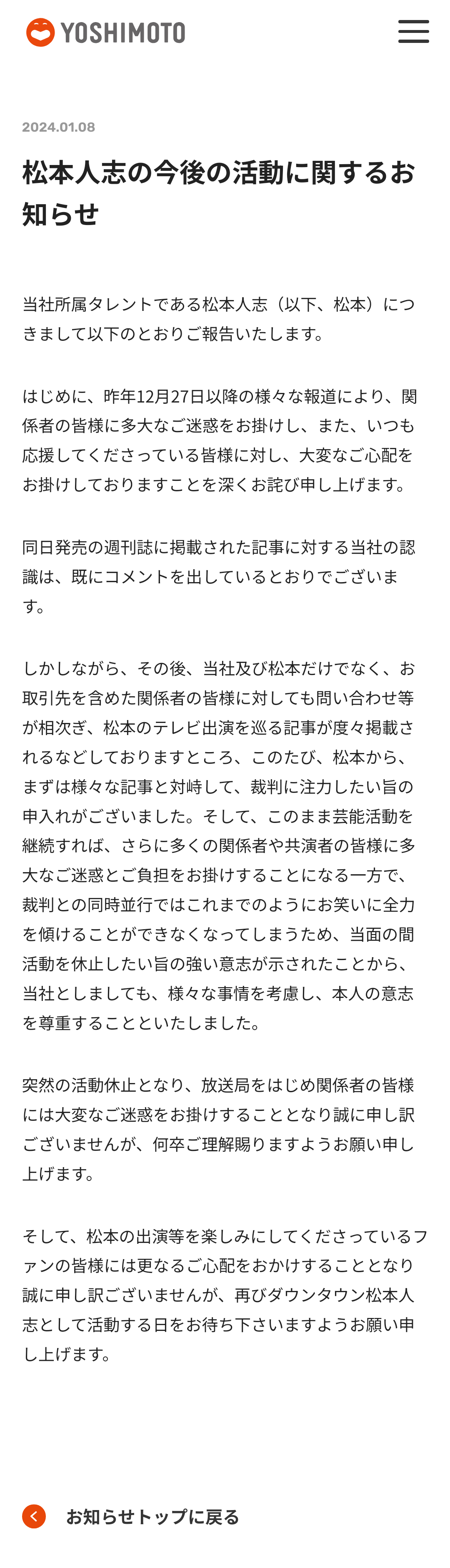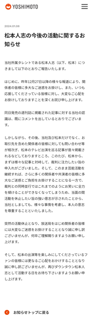 当社所属タレントである松本人志(以下、松本)につきまして以下のとおりご報告いたします。… pic.twitter.com/RrjddTQvsn— ライブドアニュース (@livedoornews) January 8, 2024