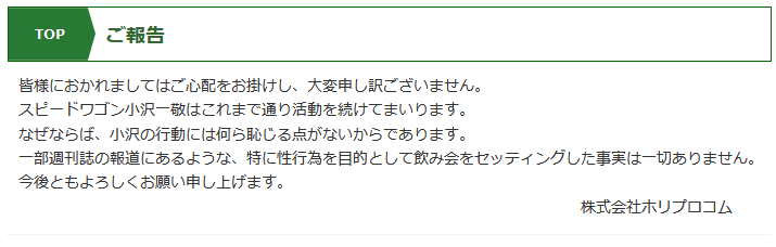 スピードワゴン・小沢一敬さんの所属事務所が、一連の週刊誌報道に対しコメントを発表しました。公式サイトでは「これまで通り活動を続けてまいります。なぜならば、小沢の行動には何ら恥じる点がないからであります」と、しています。全文はこちら