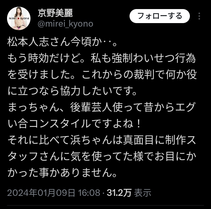 それに比べて浜ちゃんは真面目に制作スタッフさんに気を使ってた様でお目にかかった事かありません。— 京野美麗 (@mirei_kyono) January 9, 2024