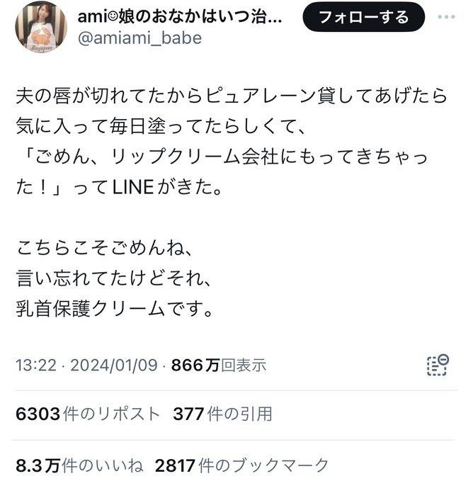 乳首保護クリームです。— ami☺︎娘のおなかはいつ治るのか (@amiami_babe) January 9, 2024
