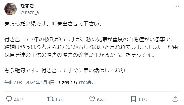 付き合って3年の彼氏がいますが、私の兄弟が重度の自閉症がいる事で、結婚はやっぱり考えられないかもしれないと言われてしまいました。理由は自分達の子供の障害の障害の確率が上がるから。だそうです。