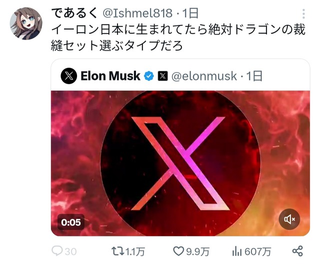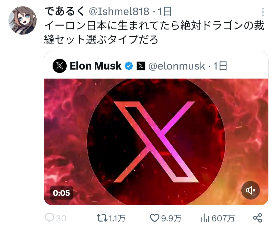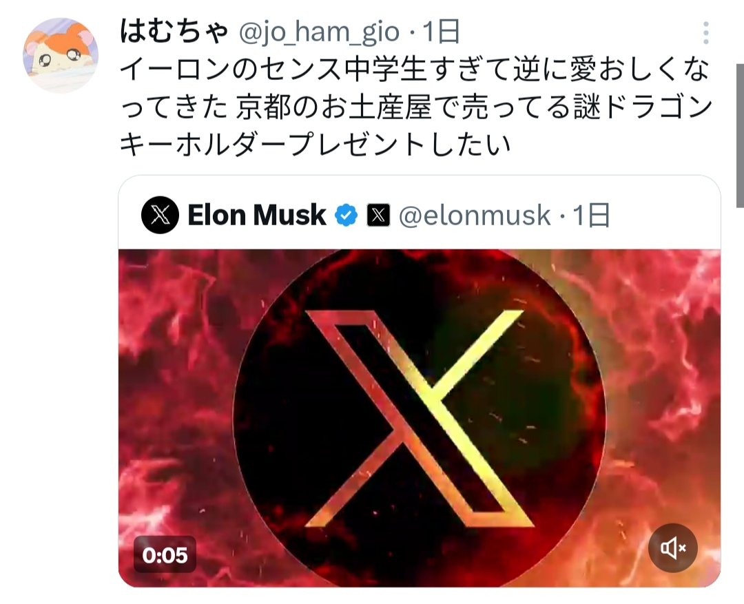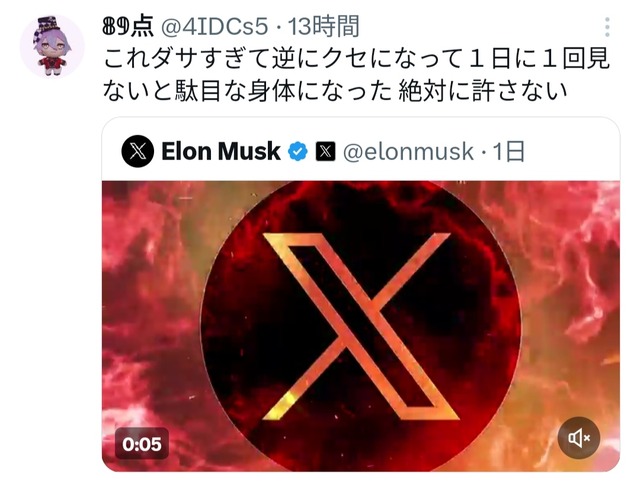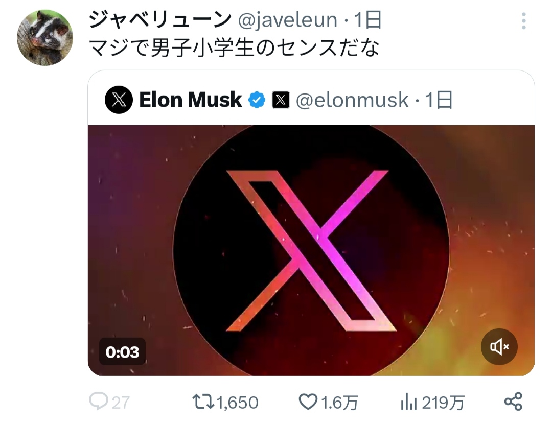 【動画】イーロンマスクが頑張って作ったXのCM、めちゃくちゃ馬鹿にされるwwwww 2024/1/12 キニ速 1:それでも動く名無し: 2024/01/12(金) 01:31:58.25ID:pEwzqZnpr 2:それでも動く名無し: 2024/01/12(金) 01:32:13.89ID:pEwzqZnpr 動画 pic.twitter.com/SG3LlYNSUK — Elon Musk (@elonmusk) January 9, 2024 10:それでも動く名無し: 2024/01/12(金) 01:34:04.23ID:jkIgkEpz0 かっけぇ…w 続きを読む Source: キニ速