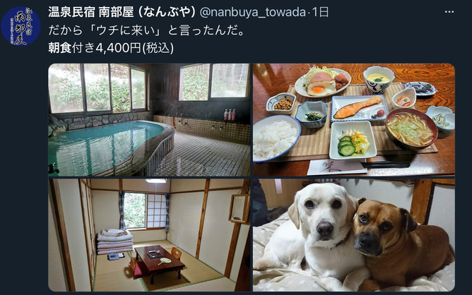 朝食付き4,400円(税込) https://t.co/hKlKMojw9j pic.twitter.com/aUwmNpdqJd— 温泉民宿 南部屋(なんぶや) (@nanbuya_towada) January 16, 2024