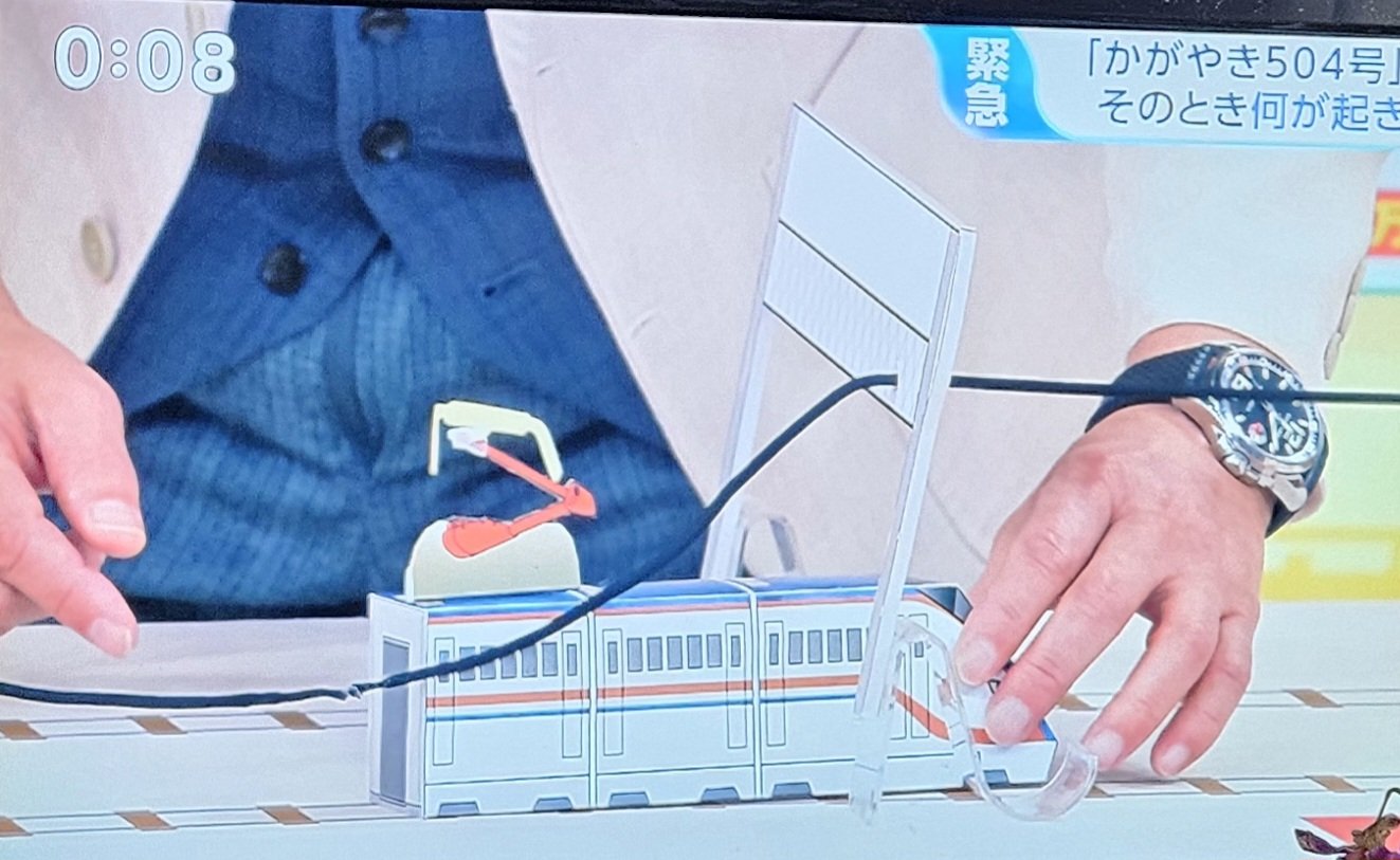 「テーブルの上に置かれていた線路には架線が設置され、途中から垂れ下がっている状態。司会の恵さんは『かがやき504号』の車両を移動させて、車両の上部にあるパンタグラフが架線から外れてしまうシーンを再現しました。その際、車両の背景に恵さんの股間が大写しになったのですが、グレーのスーツのチャックが大きく開放されていたのです」