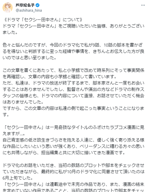 色々悩んだのですが、今回のドラマ化で、私が9話・10話の脚本を書かざるを得ないと判断するに至った経緯や事情を、小学館とご相談した上で、お伝えする事になりました。自身のブログ…