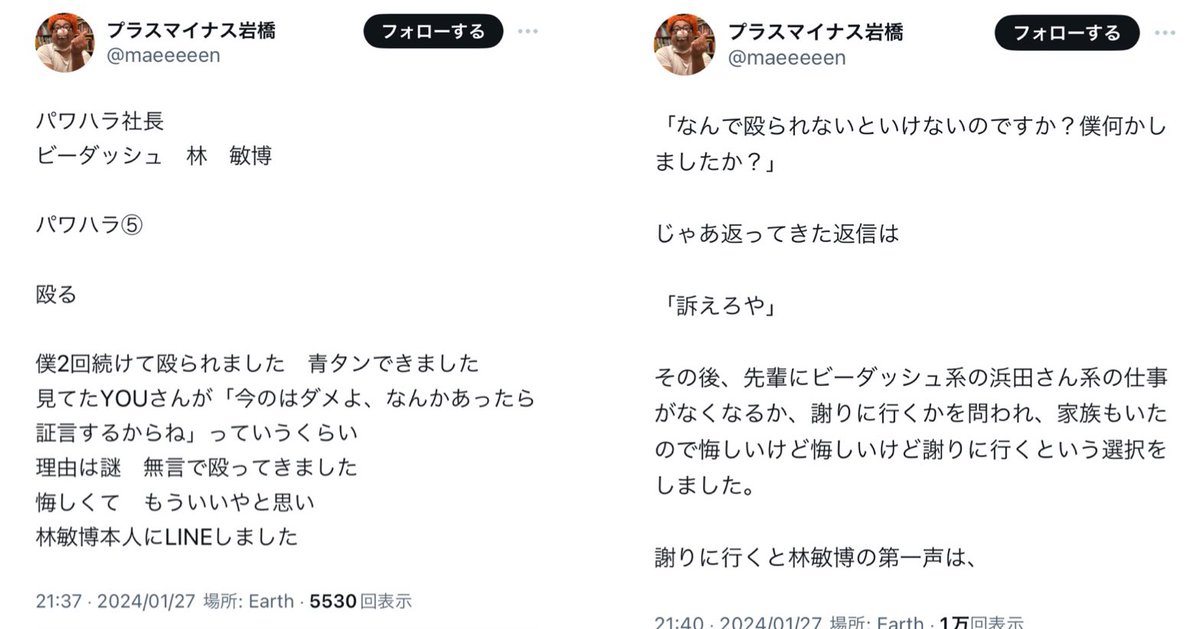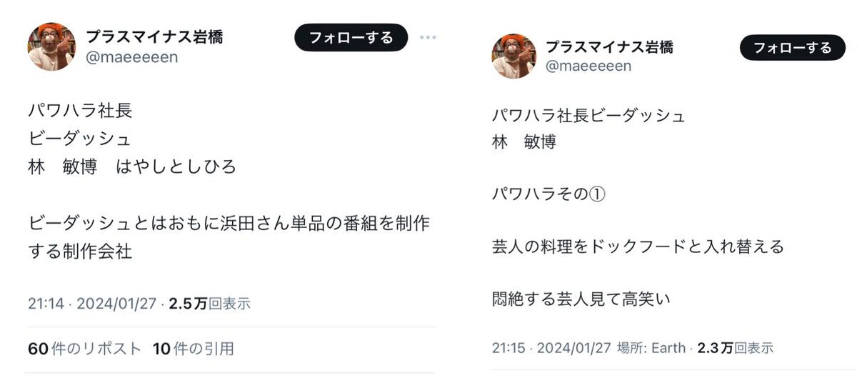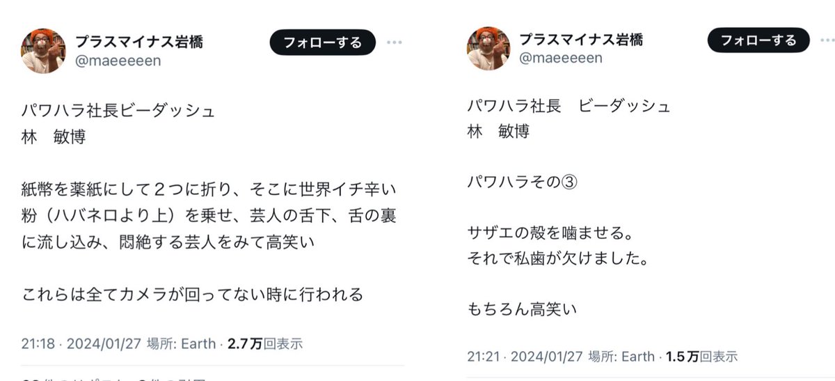 プラスマイナス岩橋さんによる、TV制作会社社長に対する突然の実名パワハラ告発、現役のお笑い芸人としては大きなリスクを背負っての行動だけど、芸能界における一連のセクハラ・パワハラ告発の数々がその下地を作り勇気を与えたのだとしたら、世の中は少しずつ良い方向に進んでるのかもしれない。 pic.twitter.com/Ru13kbl7wk